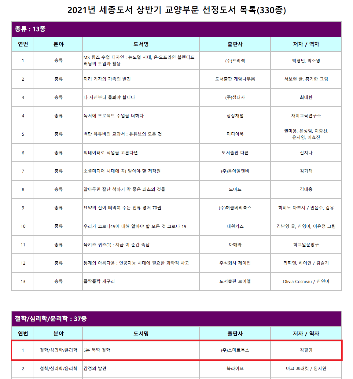 2020년 12월 출간한 김필영 저자의 『5분 뚝딱 철학』이 2021년 상반기 세종도서 교양부문에 선정되었습니다.