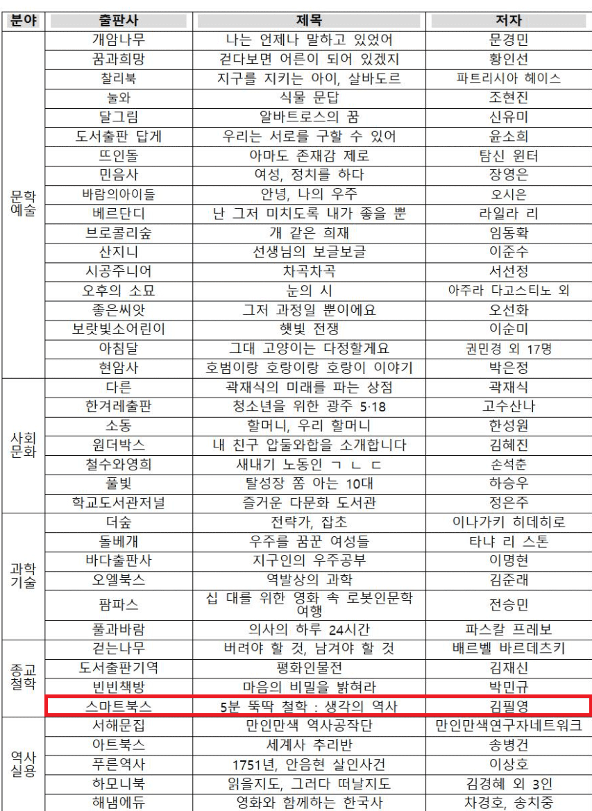 (사)대한출판문화협회와 (재)한국출판문화진흥재단은 1984년부터 청소년들이 읽기에 알맞은 교양도서를 선정·보급해 왔습니다. 이번에는 과학·기술, 문학·예술, 사회·문화, 역사·실용, 종교·철학의 5개 분야에서 총 40권의 책을 선정하였습니다.