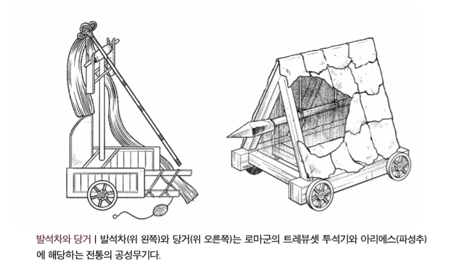 다음으로 전호피차는 성벽 가까이 접근해서 땅을 팔 수 있도록 만든 장갑무기인데, 성 아래로 터널을 만들어서 몰래 진입하기 위한 공성 무기이다. 전통의 공성 무기인 발석차와 당거도 빠질 수 없다. 발석차와 당거는 로마군의 트리뷰셋 투석기와 램헤드에 해당하는 무기였다. 수나라군이 사용한 발석차의 사거리는 약 80미터였다.